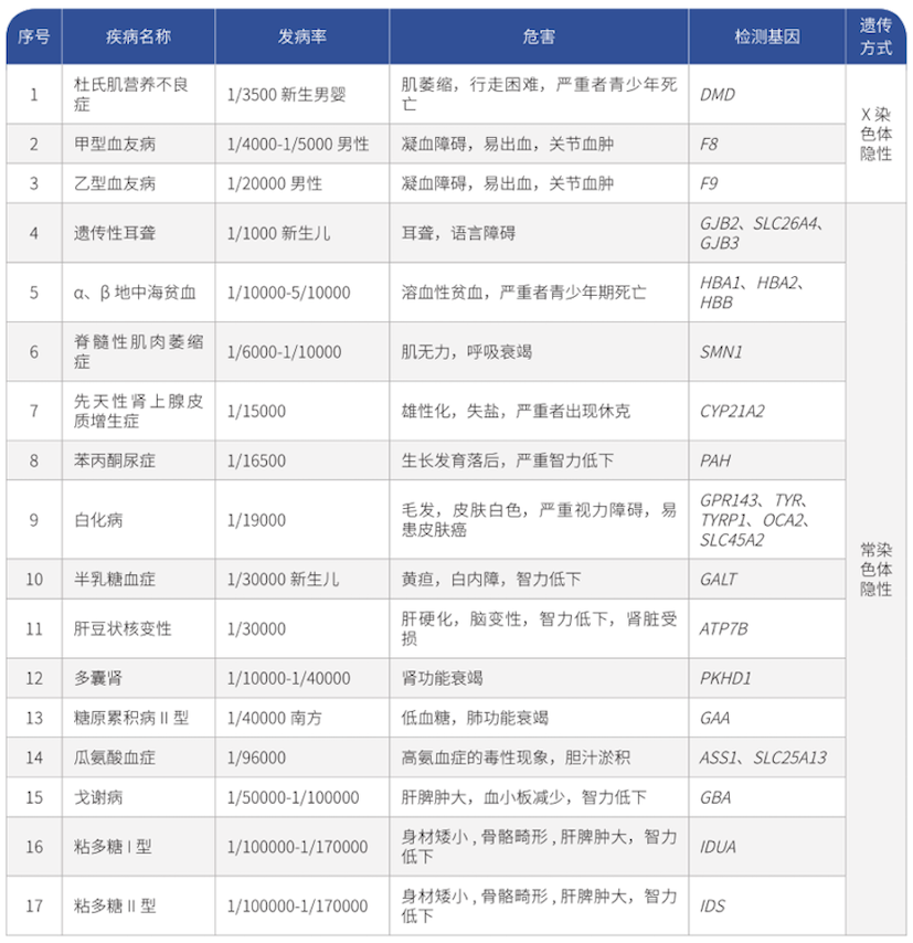 ? ? 我國每年新增90萬例出生缺陷兒,單基因病是導致新生兒出生缺陷的主要原因之一。OMIM數據庫(在線人類孟德爾遺傳數據庫)收錄的遺傳病約有7000種,其中發(fā)病機制明確的約有5000種,平均每個正常人攜帶2.8個隱性遺傳病致病突變。我國常見的單基因遺傳病有遺傳性耳聾、杜氏肌營養(yǎng)不良癥、地中海貧血、肝豆狀核變性、苯丙酮尿癥等17種,人群綜合攜帶率高達25%。這些疾病往往會致死或致畸,嚴重危害患者健康,給社會和家庭帶來極大負擔。