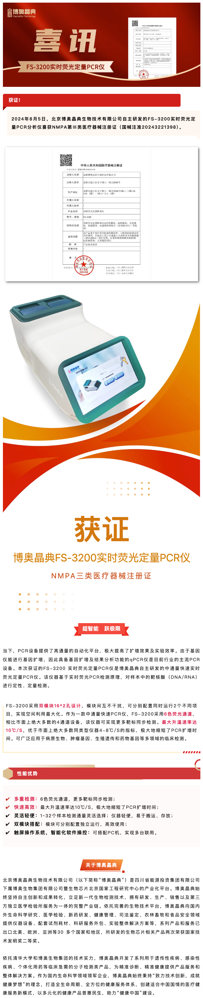 喜訊丨博奧晶典FS-3200實(shí)時(shí)熒光定量PCR儀獲NMPA三類醫(yī)療器械注冊(cè)證!