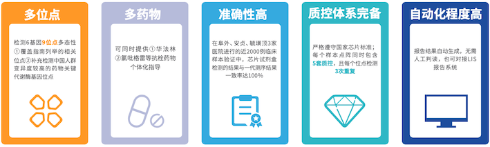 抗栓治療用藥相關(guān)6個(gè)基因位點(diǎn)多態(tài)性檢測(cè)試劑盒(微陣列芯片法)采用多重等位基因序列特異性PCR結(jié)合通用微陣列芯片(Allele-Specific PCR-based Universal Array,ASPUA)方法,對(duì)人基因組DNA中VKORC1、CYP2C9、CYP4F2、GGCX、CYP2C19和CYP3A4這6個(gè)基因的9個(gè)多態(tài)性位點(diǎn)進(jìn)行檢測(cè)。
