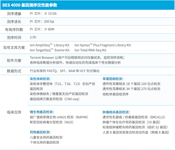 晶芯®BioelectronSeq 4000 基因測(cè)序儀(簡稱 BES 4000)是由博奧與美國 Thermo Fisher 公司合作在國內(nèi)研發(fā)、生產(chǎn)的新一代高通量測(cè)序儀。該款測(cè)序儀采用半導(dǎo)體芯片測(cè)序技術(shù),結(jié)合臨床檢測(cè)試劑盒和自動(dòng)化分析軟件,適合用于醫(yī)院獨(dú)立開展基因檢測(cè)工作。BES 4000 已于 2015 年 2 月獲得 CFDA 醫(yī)療器械注冊(cè)證(醫(yī)療器械注冊(cè)證號(hào):國械注準(zhǔn) 20203220502)。