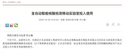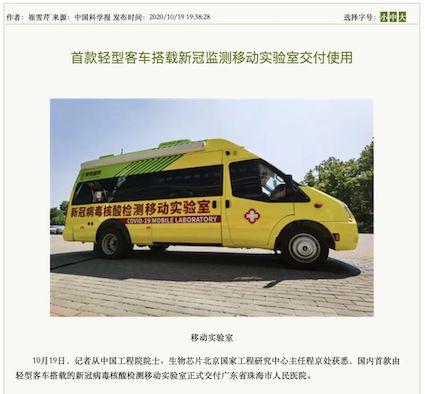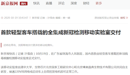 10月19日,“珠海市核酸檢測(cè)基地”在廣東省珠海市人民醫(yī)院正式揭牌啟用。揭牌儀式上,由清華大學(xué)、生物芯片北京國(guó)家工程研究中心和北京博奧晶典生物技術(shù)有限公司共同自主研發(fā)的首款輕型客車搭載的全集成新冠檢測(cè)移動(dòng)實(shí)驗(yàn)室正式亮相。