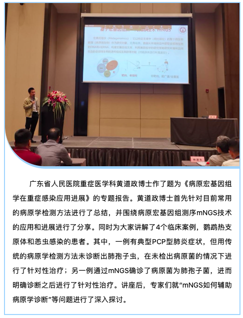 日前,福建省重癥醫(yī)學(xué)培訓(xùn)會(huì)——中國(guó)重癥醫(yī)學(xué)多學(xué)科精髓(MCCRC)培訓(xùn)班在福州召開。本次培訓(xùn)班邀請(qǐng)了省內(nèi)外知名專家圍繞重癥醫(yī)學(xué)領(lǐng)域新技術(shù)的發(fā)展等內(nèi)容進(jìn)行了專題報(bào)告,其中,廣東省人民醫(yī)院重癥醫(yī)學(xué)科黃道政博士及博奧晶典產(chǎn)品總監(jiān)劉瑩瑩博士受邀出席,并作了題為“病原宏基因組學(xué)在重癥感染應(yīng)用進(jìn)展”和“病原宏基因組學(xué)報(bào)告解讀”的專題報(bào)告,報(bào)告受到福建省醫(yī)學(xué)會(huì)重癥醫(yī)學(xué)分會(huì)主任委員、福建醫(yī)科大學(xué)附屬第一醫(yī)院ICU主任林建東教授的支持與點(diǎn)評(píng)。