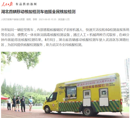 作為科技抗疫的標(biāo)志性成果,新冠病毒核酸檢測移動實驗室可以讓核酸檢測更加準(zhǔn)確便捷,安全快速,接通220V民用電或啟動車上自帶的發(fā)電機即可正常工作,采樣可通過口咽拭子采樣機械臂和人工兩種方式完成。其裝載的全集成芯片實驗室系統(tǒng)45分鐘即可完成全程實驗,最快35分鐘報告陽性結(jié)果,檢測靈敏度可達150拷貝/毫升。如此出色的性能使其特別適合在社區(qū)發(fā)生聚集性疫情和縣鄉(xiāng)村等醫(yī)療條件相對較差的場景下發(fā)揮優(yōu)勢。在為市民完成檢測后,檢測結(jié)果會通過5G通信系統(tǒng)實時上傳到醫(yī)院的核酸檢測實驗室,經(jīng)過審核后上報武漢市衛(wèi)健委的核酸檢測系統(tǒng)。“輕騎兵”每天可以完成近800份樣品的檢測,為武漢市全民核酸檢測提供有力支持,在此次武漢疫情中發(fā)揮了積極作用。