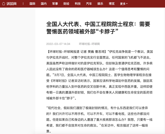 “伊拉克戰(zhàn)爭就是一個(gè)教訓(xùn),美國與伊拉克開戰(zhàn)時(shí),對整個(gè)伊拉克實(shí)行全面禁運(yùn),任何國家的飛機(jī)都飛不進(jìn)去,美國雖然聲稱這樣做針對的是伊拉克軍隊(duì),但卻殃及普通伊拉克百姓,許多病人因此沒有了救命的藥和醫(yī)療器械該怎么辦?這是一個(gè)值得思考和警惕的問題。”3月7日,全國人大代表,中國工程院院士、醫(yī)學(xué)生物物理學(xué)家程京在接受《環(huán)球時(shí)報(bào)》記者采訪時(shí)表示,國家應(yīng)該科學(xué)地謀劃中醫(yī)藥的發(fā)展,鼓勵(lì)其他學(xué)科的力量加入到中醫(yī)藥的交叉創(chuàng)新中來,真正實(shí)現(xiàn)中西醫(yī)并重,這樣即便有朝一日真的遭遇外部封鎖,我們也不會在事關(guān)人民健康和生命安全的醫(yī)藥領(lǐng)域被外部卡住“脖子”。