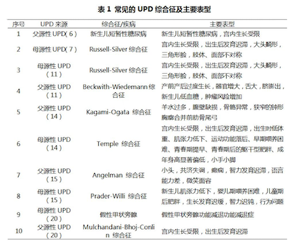 大多數(shù)染色體UPD沒有臨床表型,當(dāng)UPD發(fā)生在印記基因區(qū)域則會(huì)導(dǎo)致印記基因異常,出現(xiàn)異常的表型。目前針對(duì)上述UPD綜合征(表1)尚無有效的治療手段,因此,早發(fā)現(xiàn)、早診斷、早干預(yù)對(duì)于此類疾病的防控尤為重要。