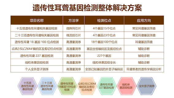 博奧晶典遺傳性耳聾相關(guān)基因檢測芯片的不斷升級迭代,有助于篩查出更多致聾基因變異人群,盡早為其提供生活指導(dǎo),降低耳聾發(fā)生風(fēng)險(xiǎn),早診斷、早干預(yù)、早治療。目前,博奧晶典已推出基于微陣列芯片、微流控芯片及高通量測序平臺一系列產(chǎn)品及服務(wù),包括:十五項(xiàng)遺傳性耳聾基因檢測、二十三項(xiàng)遺傳性耳聾相關(guān)基因檢測、藥物性耳聾基因檢測、遺傳性耳聾基因檢測(100項(xiàng))、遺傳性耳聾基因檢測(227個基因)、線粒體基因組檢測、全外顯子組基因檢測等,為備孕期及孕早期夫婦、新生兒及聽障人群提供最佳的篩查、診斷方案,同時提供專業(yè)的報(bào)告解讀及后續(xù)遺傳咨詢服務(wù),以實(shí)際行動全面助力耳聾三級防控,減少聾兒的發(fā)生。